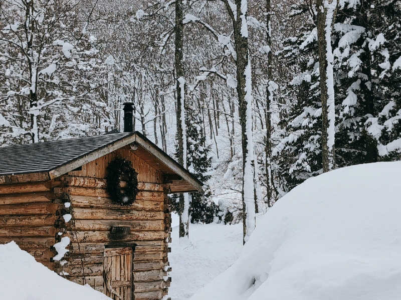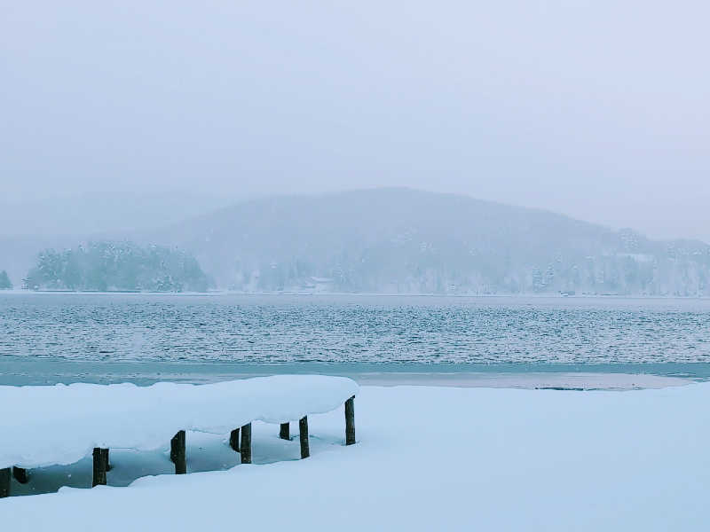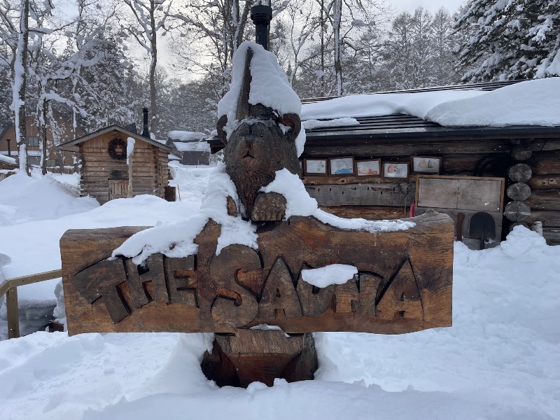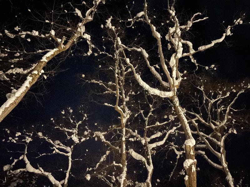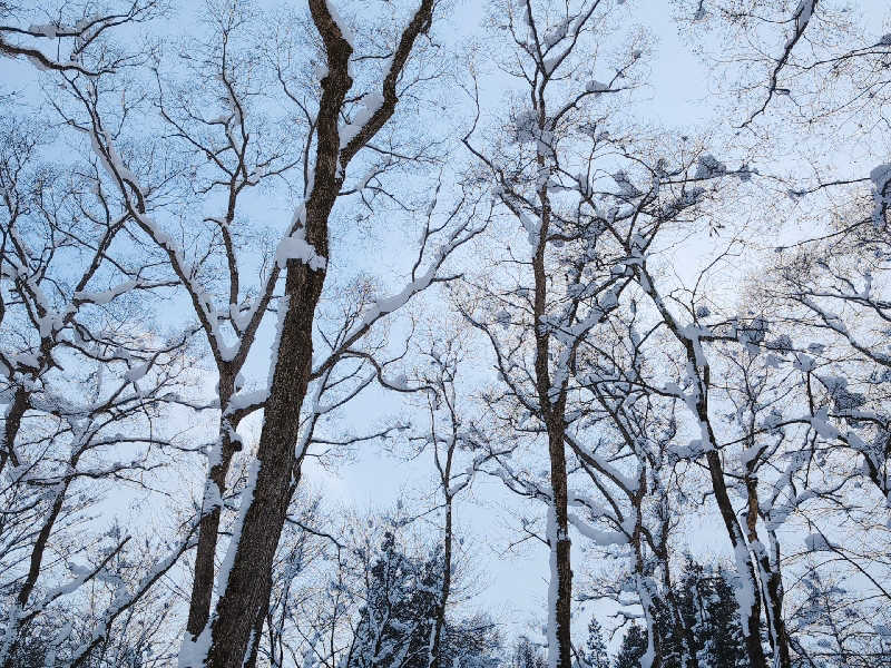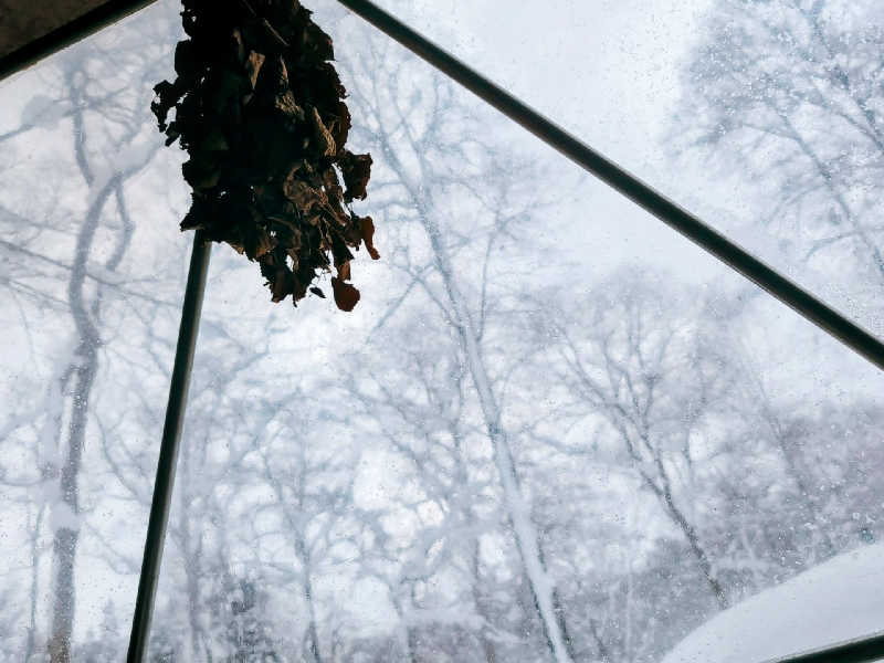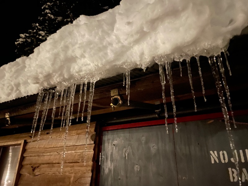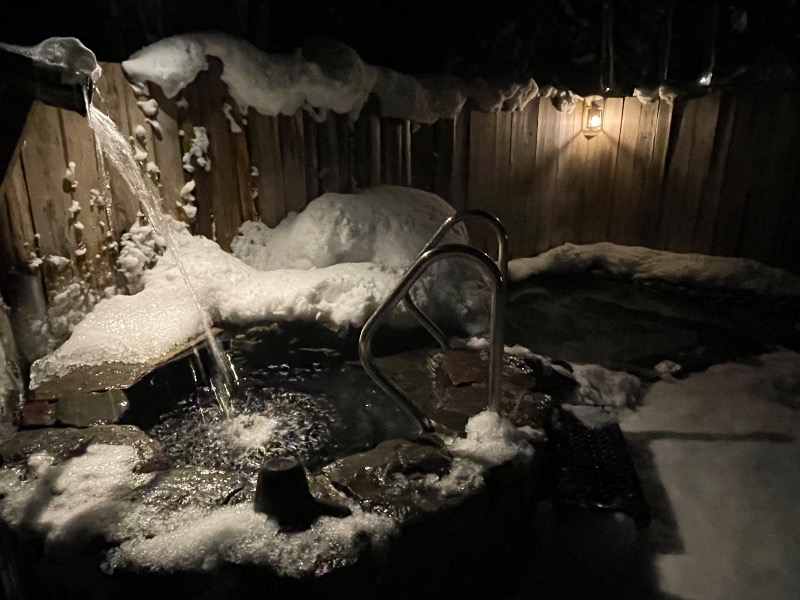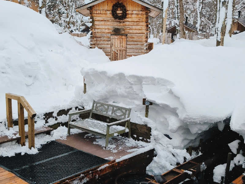 インフィニティチェアを倒して雪が積もる木々を眺めながらの外気浴…気持ちいい、至福