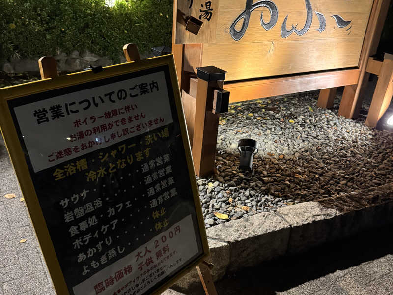 なんと現在ボイラー故障の影響で“水しか出ない”という状況にもかかわらず、入浴料金が破格の200円!これは行くしかないと、1週間分の仕事を残業で一気に片付けておぶ〜へGO🚗💨