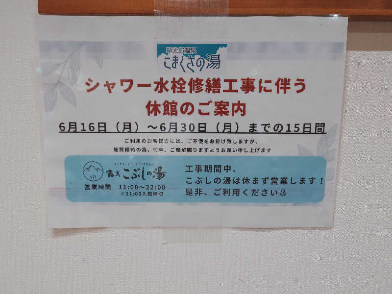 余談ですが『こまくさの湯』さん、シャワー水栓修繕工事の為6月16日~6月30日まで休館されるそうです🚿