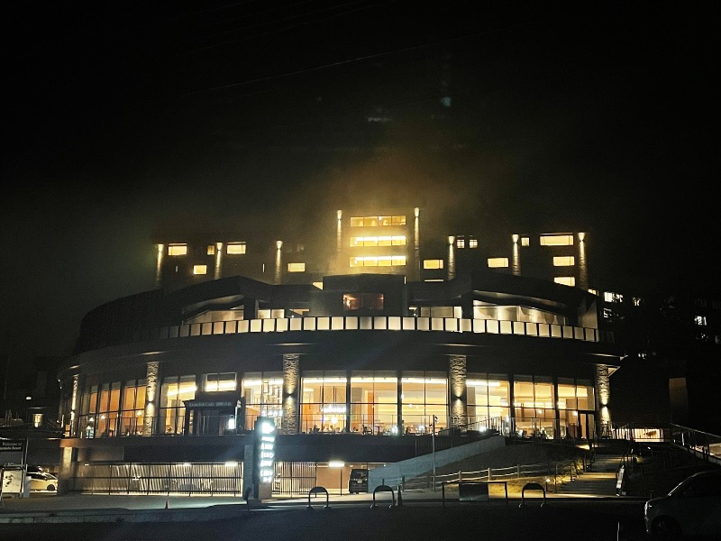 夜の外観は要塞のよう。上がっていくとレストランがあり夕食を楽しんでいる人で賑わっていた。この時間はサウナチャンスに違いない。同行者によると昼は白樺湖が一望でき最高の景色が楽しめると言うがすっかり暗い。