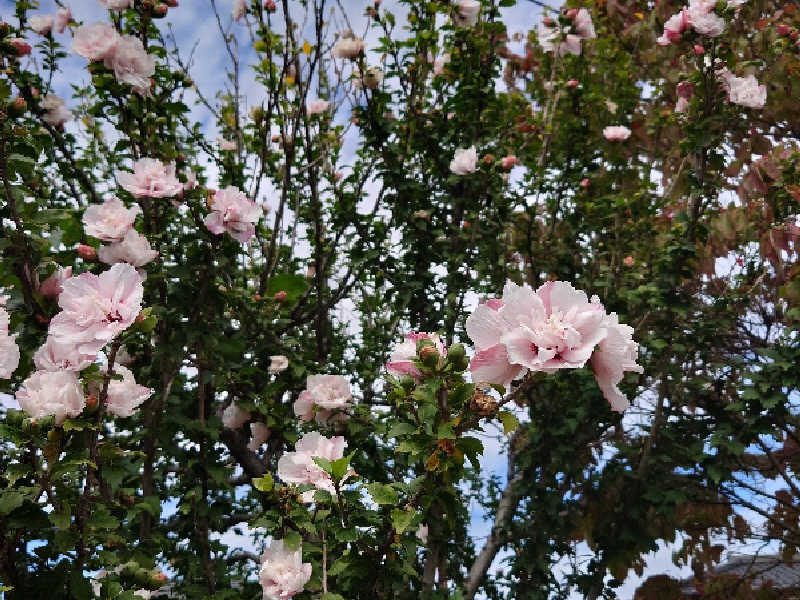 外気浴中、駐車場の片隅に綺麗なお花が咲いてるのが気になりました🌸グーグルレンズで調べたらムクゲ(木槿)みたいです。