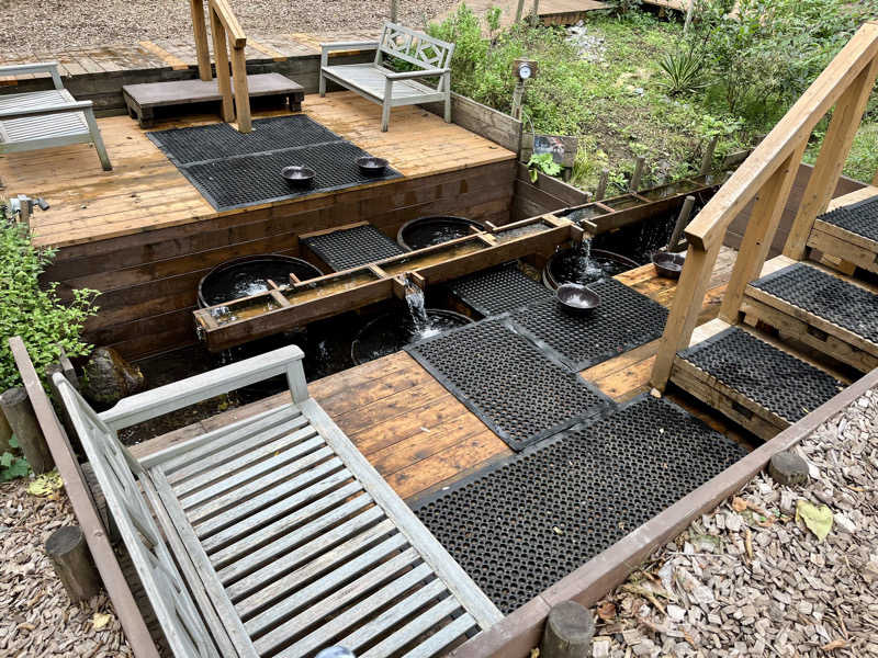 サ室のすぐ隣りにあるので動線◎ 黒姫山の伏流を引き込んだ、掛け流し天然の水風呂が4つ並ぶ。季節で水温の変動はあるみたいだが、しっかり良き冷たさです! 『ぜんぶ、自然』最高です😇