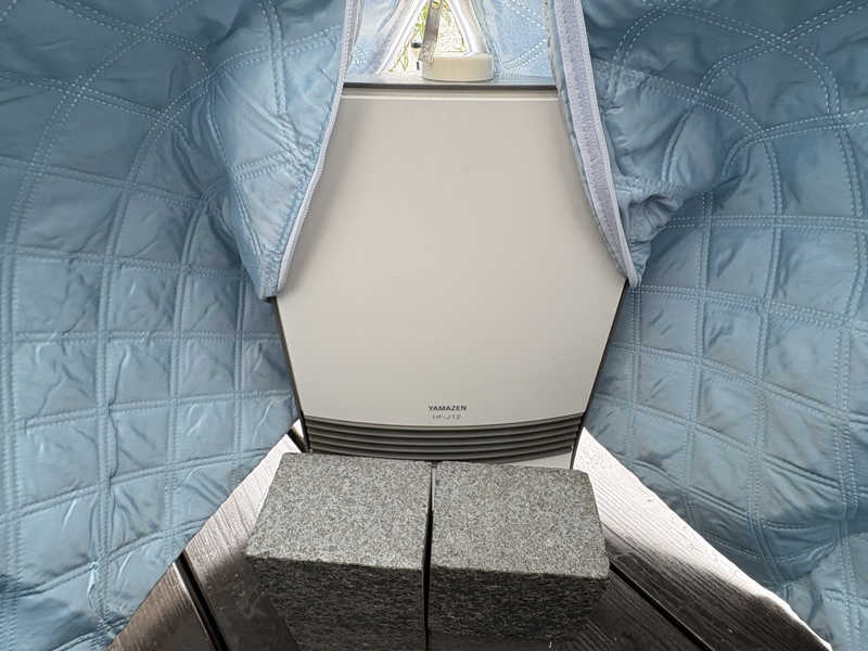 キャンプ用シャワーブースにセラミックファンヒーター、大理石コロがサウナストーン代わり、結構いい感じ。