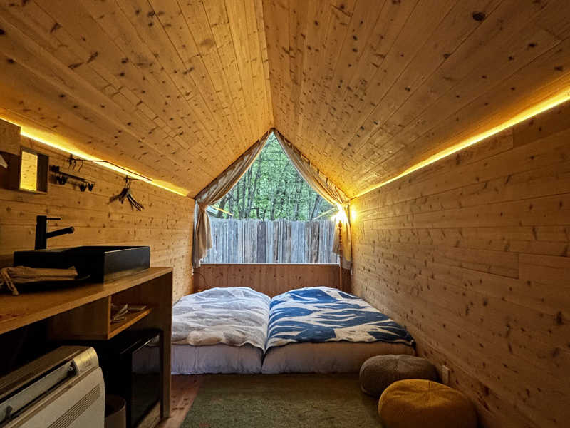 アメニティ置き場よりサウナバックをピックアップします。森のサウナに入るとインフィニティチェアと焚き火台がある外気浴スペース、その奥に水風呂と滝、左右にサウナ室と内気浴室があります。サウナマットを持って入ります。大きなストーブと並行に3段の座面があり10名程が座れる大きさです。正面に大きなガラス窓があり外光を取り入れるスタイルです。温度は96度とじんわり熱いです。セルフロウリュができより熱くすることも可能です。反対側の部屋はサウナ室と同じ造りで内気浴スペースとして使うことができます。しっかり汗をかき水風呂へ。温度は体感16度とシンシンと冷たく、天然水のため柔らかく気持ちいいです。深さが120㎝あるので首まで浸かれます。浅い水風呂のほうでは滝のように水が降り注ぐので滝行もできます。ととのいスペースは内気室もいいですが、やはり森に囲まれた外気浴が最高です。インフィニティチェアで仰向けになると木々が大きかぶさって青空を眺められる最高な環境です。新鮮な山の天然水をいただきながらととのえます。20時からは焚き火サービスがあり、揺れる炎、パチパチ音が森に響き渡ります。