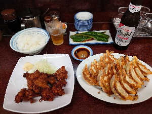 餃子2人前🥟生ビール🍺瓶ビール🍺唐揚げ、ライス🍚、きゅうりの丸漬🥒 ギョービー最高😋