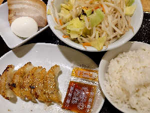 博多ひとくち餃子5個 白ごはん タンメン野菜 半熟塩玉子 厚切りバラチャーシュー