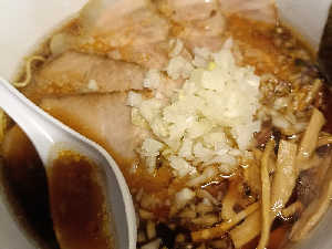 玉ねぎにコッテリ目な醤油スープ、食べ応えのある麺が美味しかったです。