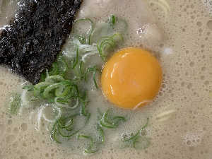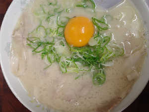 博多ラーメンよりややあっさりでやや太麺、生卵が特徴的な。うますぎる!