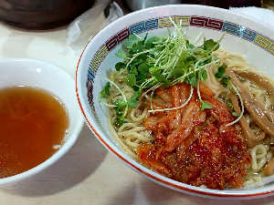 汁多めの油そば、美味い。 半チャーハンは米硬めでシンプル。