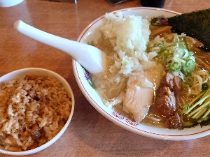 Bセットはとりめしとダシ中華。秋田のラーメンならやっぱり鳥!増量した玉ねぎも美味しい!