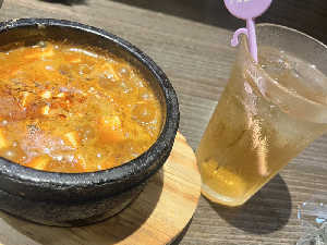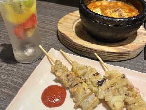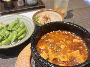 陳麻婆豆腐とガーリック枝豆と梅軟骨と梅スカッシュ