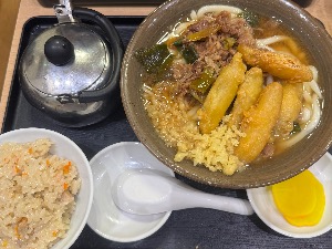 うどん大盛がめちゃキツイ。何とか完食、かしわ飯最高