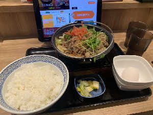安定の吉野家。牛丼にショウガと七味が美味い。野菜を摂れるのも嬉しい。