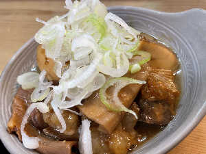 煮卵入り(小サイズ)。老舗の煮込みは味がよく染み込んでる。牡蠣のグラタン、辛子蓮根の春巻きも絶品!