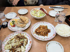 生ビール✖️2、ジャストサイズ唐揚げ、野菜炒め🥬 足が吸い込まれてしまう😇 ギョービー最高😋