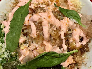 汁少なめ+卵黄でマイルド寄りな濃厚味で、フライドエシャロット¥50の食感がアクセント