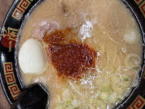味の濃さ基本、超こってり、にんにく1片分、白ネギ、チャーシューあり、赤い秘伝のタレ2倍、かため