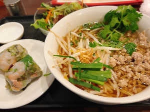 味付けされた蒸し鶏のフォー。サイドメニューは3種類から選べる。生春巻きは大葉がアクセント!