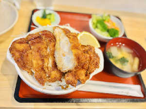 厚切りのカツに山盛りのキャベツでお腹いっぱいになります。とても美味しい!