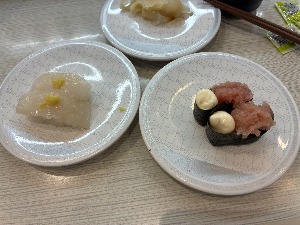 遅めのモーニングを頂いていたので、軽めの回る寿司で