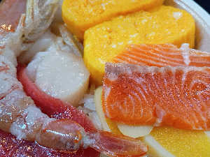 チケットを買って、市場の各店舗にある魚介類をチケットと引き換えに乗せるシステム。次は朝イチで行きたい