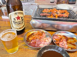4種鶏焼肉と瓶ビール大瓶がセットで¥1100!まさに呑兵衛のオアシス🍺