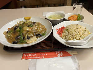 900円というリーズナブルな価格で五目焼きそばとチャーハンとエビチリとスープまで付いてくる♪うまい🤤
