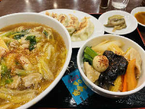 タンメンは硬めをチョイス。これかなり旨い😋チャーは俺の勝ち✌️川崎餃子はこの食べ方だな🥟(写真⑨参照)