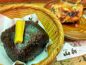 梅・鮭・昆布の山賊むすびに、山賊焼を添えて✨
