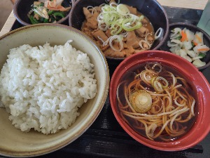 初もつ次郎!お椀がソバなのはナイス!!もつ煮美味しい😋でもごはんがちょっとベチャって感じ😅
