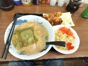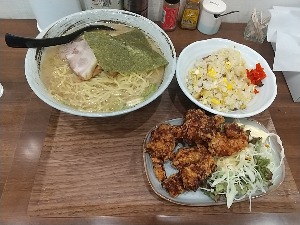 お店早く閉まるのでサ前飯🍚 野菜もご飯もたっぷりで美味しい 唐揚げも大当たりで大満足❗