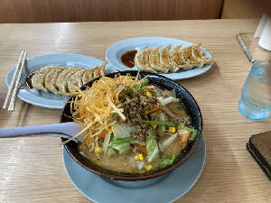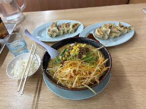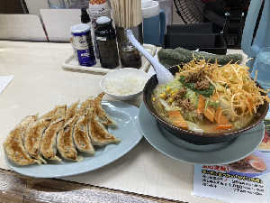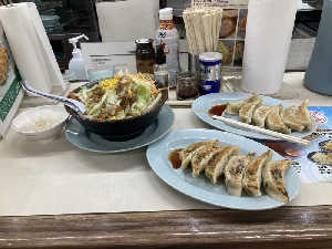 →麺大盛、もやし、辛ネギトッピング →野菜もりもり、餃子も美味すぎる!