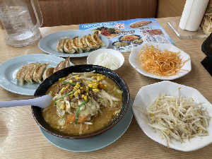 →麺大盛、もやし増し、辛ネギトッピング →野菜たっぷり濃厚スープがサウナ後に染みる。餃子🥟美味すぎる