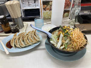 →麺大盛り、辛ネギトッピング、もやし増し →野菜しっかり炒めてあり香ばしい。餃子は無限♾️に行けます🤤