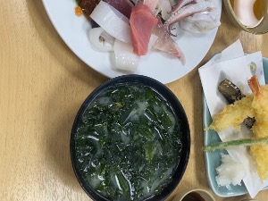 ハマチの刺身とワカメの味噌汁が神