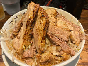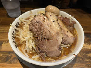 二郎系ラーメンの上に柔らか炙り焼豚が4枚乗っているインパクト大な🍜。