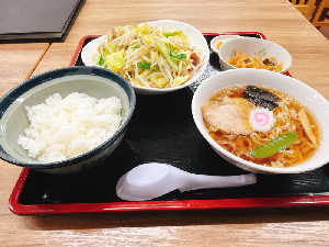 半ライス➕ミニラーメン変更。 昨日頼んだ肉野菜炒めが、ちょっとイメージと違ったので、本日はもつ煮定食
