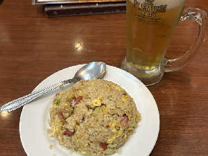 生ビール 牛モツの黒豆ソース炒め 海老餃子 五目炒飯