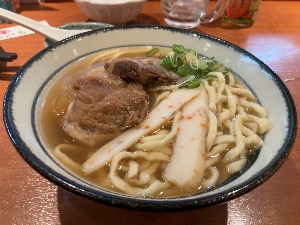 普通の鉄板スパと思いきや、麺が沖縄そばだった。美味しかったです。