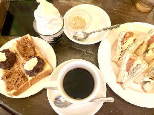 少し足をのばして深煎り珈琲。餡ときな粉ト〜スト合う♡サンドの斬新な素材合わせ(驚❗️甘塩っぱ新感覚味❣️