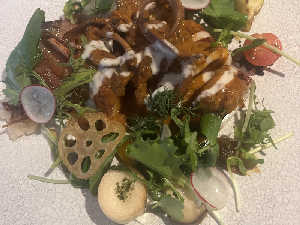 泡のとろろご飯うま🍚鶏も香ばしく蓮根の素揚げなど野菜、付け合わせの副菜も絶品❣️うま〜😋
