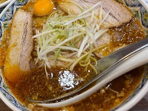 チャーシューは柔らかく、麺細め。辛さ控えめ。みじん切り玉ねぎすくう穴あきレンゲ付き。