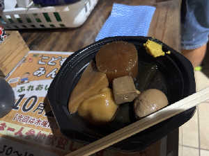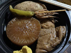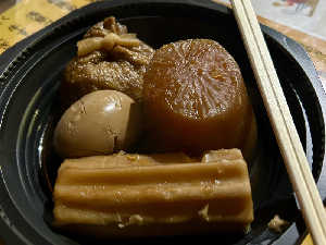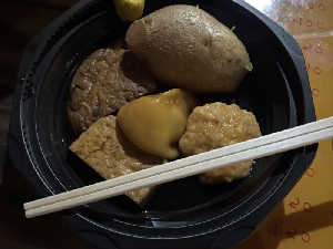 4品から容器代が無料になります。たまご、大根、じゃがいも、練り物を注文。ハンペンはサービス