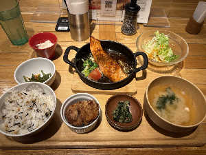 唐揚げトッピングで魚も肉も 五穀ひじきご飯の食感が良い お替わりフリーありがたい
