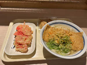 大阪のうどんにとりご飯、とり天を添えて。 コスパもよく出汁も効いていて美味しかった。