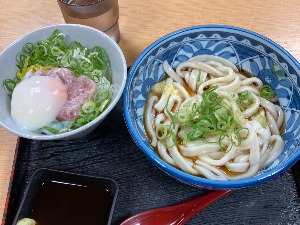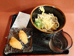 いなり付き。サウナの後に冷たいうどんが効くねえ。
