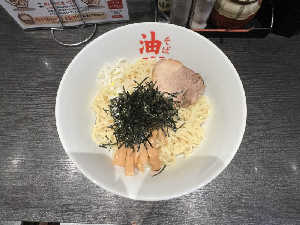 次○系のにんにく、ヤサイ、アブラ増しの油そば、写真は茹で前140gの並盛ですが、大盛、ダブルもあり。