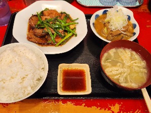 ご飯大盛無料、中辛、煮玉子・ポテサラ追加。唐辛子辛めなタレの絡んだもつで大盛ご飯がよく進む。