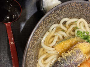 よくしまった本気うどんにタルタルチキンのソースがトッピングの卵と絡まり最高