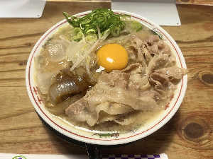豚白湯スープに甘辛豚肉と生卵が絡まってサ飯に最高